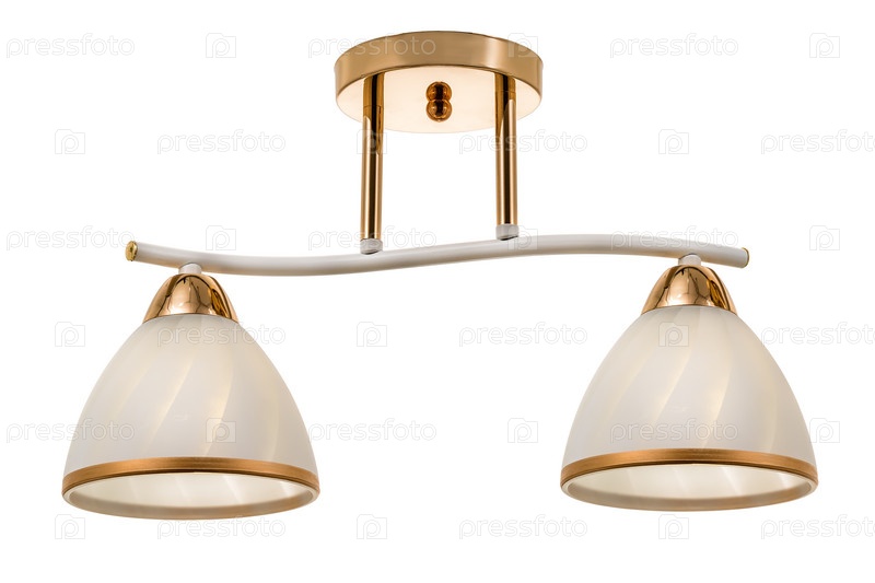 Белый потолочный светильник с двойной лампой с золотым основанием и матовыми белыми плафонами. Изолированные на белом фоне