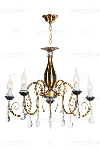 Подвесная потолочная люстра на пять ламп. С лампочками в форме свечей. Изолированные на белом фоне
