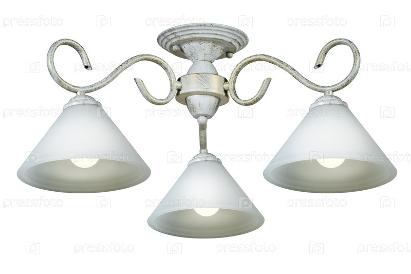 Потолочный светильник из бронзы с тремя плафонами из матового стекла, окрашенный в белый цвет. Изолированные на белом фоне