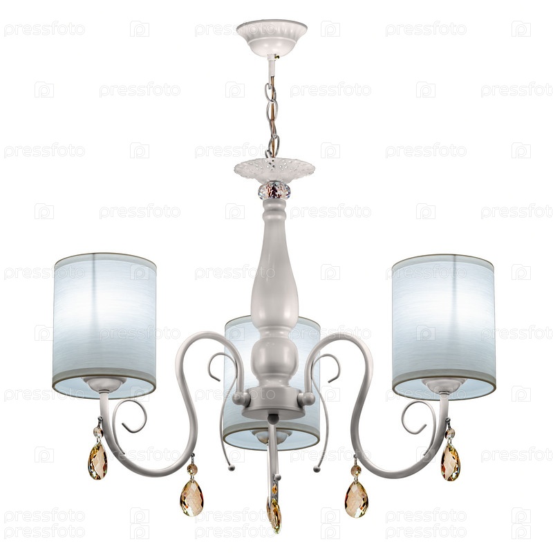 Трехламповая подвесная потолочная люстра с тканевыми абажурами. Изолированные на белом фоне