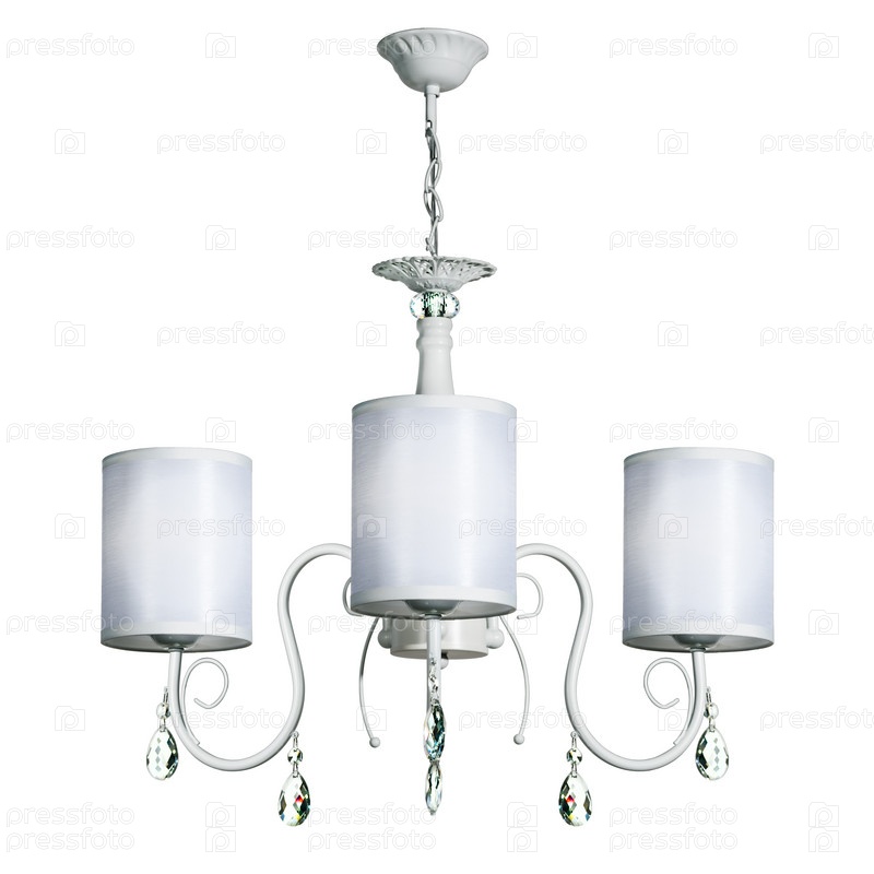 Трехламповая подвесная потолочная люстра с тканевыми абажурами. Изолированные на белом фоне