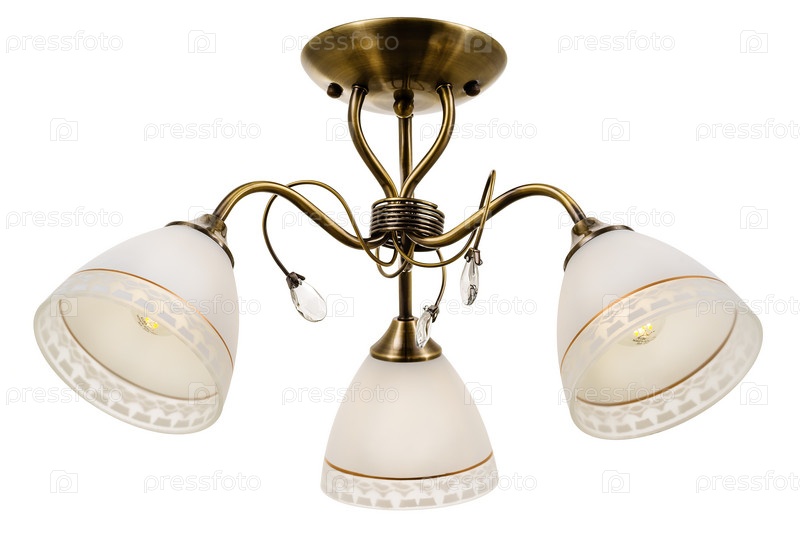 Трехламповая бронзовая люстра с плафонами из матового стекла с геометрическим орнаментом. Изолированные на белом фоне