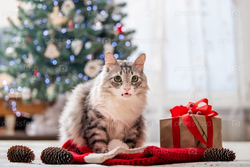 Рождественский кот. Портрет толстого пушистого кота рядом с подарочной коробкой на фоне елки и огней гирлянд