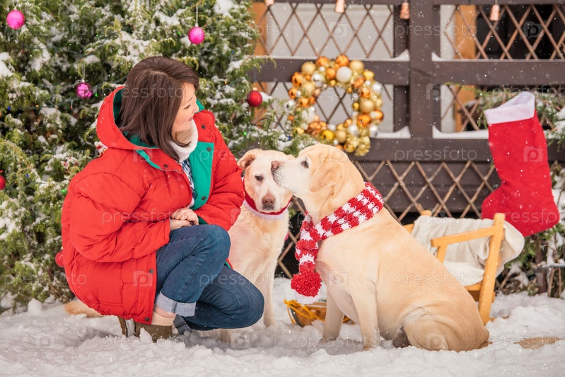 Женщина играет с лабрадорами возле украшенной елки во время снегопада зимой во дворе многоквартирного дома