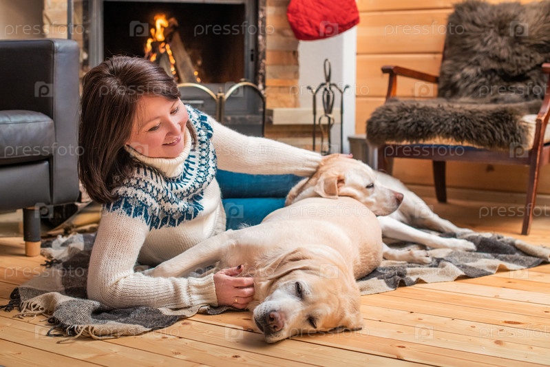 Золотые лабрадоры-ретриверы лежат вместе с азиаткой средних лет на одеяле перед камином в загородном доме