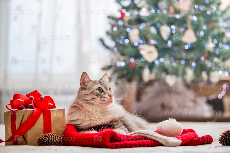Рождественский кот. Портрет толстого пушистого кота рядом с подарочной коробкой на фоне елки и огней гирлянд