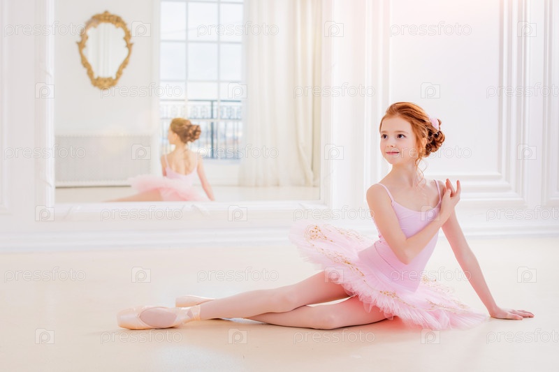 Маленькая балерина в розовой пачке и пуантах позирует в белой студии