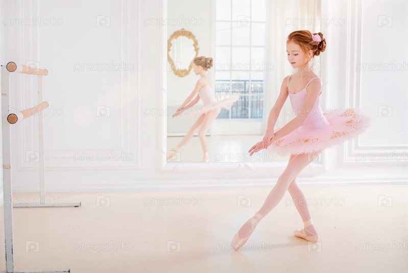 Маленькая танцовщица-балерина в платье-пачке учится балетному танцу в танцевальной школе