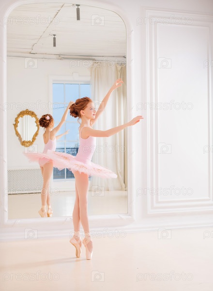 Маленькая балерина в розовой пачке и пуантах позирует в белой студии