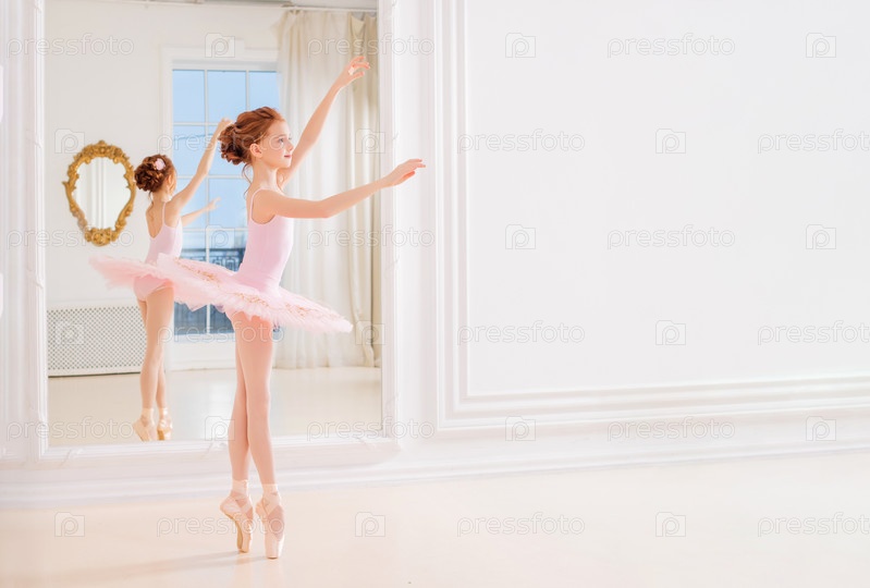 Маленькая танцовщица-балерина в пачке учится балетному танцу в танцевальной школе