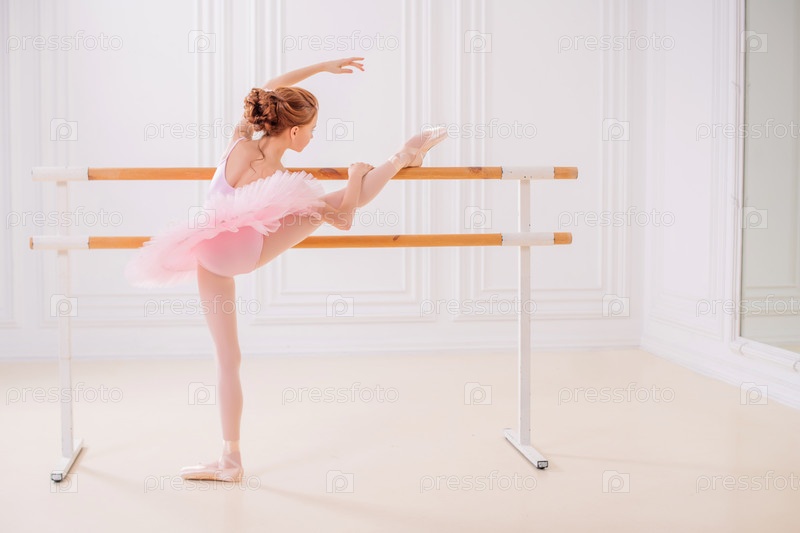 Маленькая танцовщица-балерина в пачке учится балетному танцу в танцевальной школе