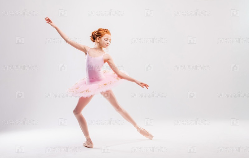 Маленькая балерина в розовой пачке студентка академии позирует на белом фоне