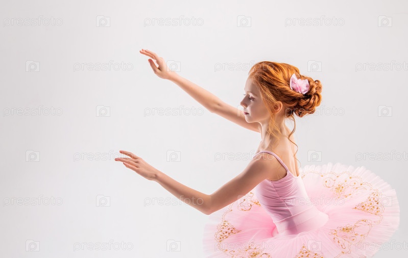 Портрет маленькой нежной рыжеволосой девочки в розовой пачке с пуантами, мечтающей стать балериной