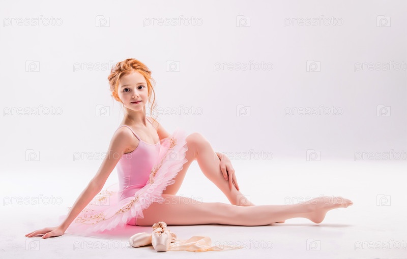 Портрет маленькой нежной рыжеволосой девочки в розовой пачке с пуантами, мечтающей стать балериной