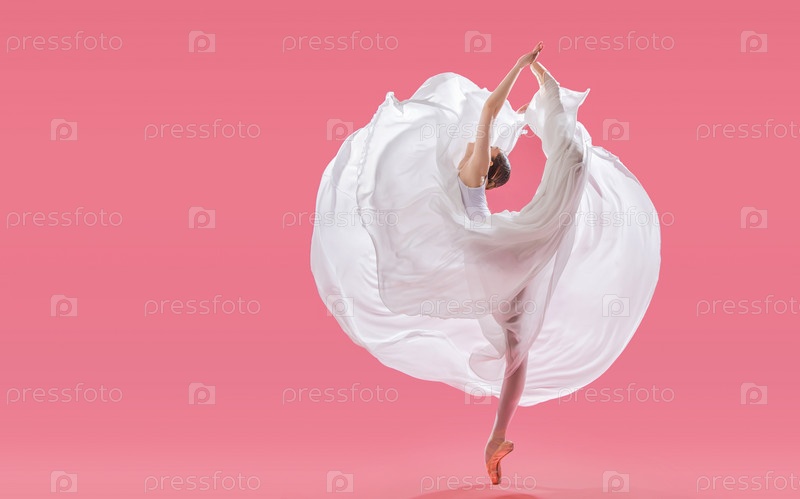 Элегантная балерина в пуантах танцует в длинной белой юбке на розовом фоне