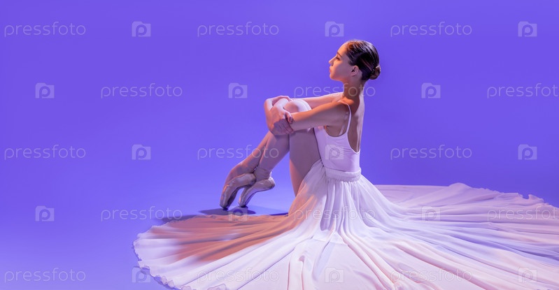 Элегантная балерина в пуантах сидит, вытянув ноги в длинной белой юбке на сиреневом светлом фоне