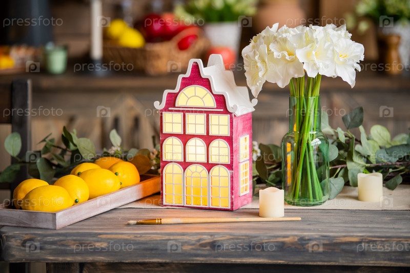 Игрушечный декоративный ламповый дом стоит на деревянном столе среди весенних цветов и элементов интерьера