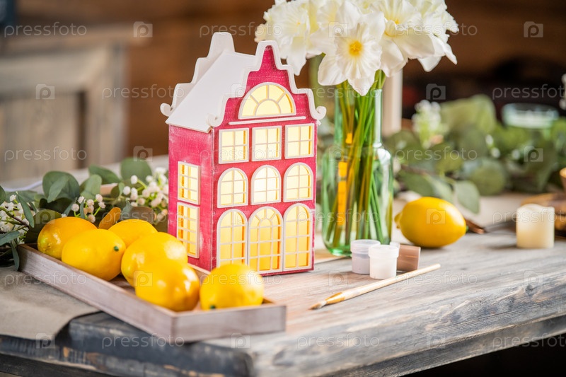 Игрушечный декоративный ламповый дом стоит на деревянном столе среди весенних цветов и элементов интерьера
