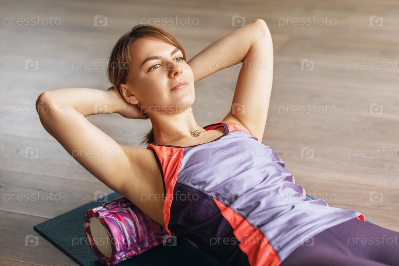 Женщина выполняет миофасциальную релаксацию гипергибких мышц спины с помощью массажного ролика, лежит на коврике в студии