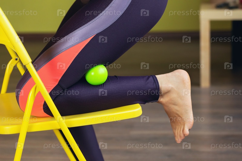 Женщина в спортивной одежде выполняет миофасциальную релаксацию сверхгибких мышц ног с помощью массажного мяча на стуле в студии