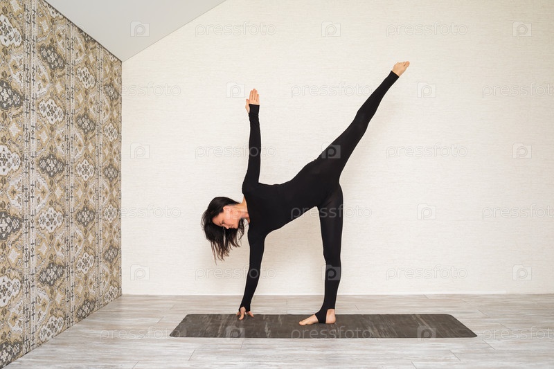 Женщина в черной спортивной одежде занимается йогой, делает упражнения Ардха Чандрасана, поза полумесяца, тренируется, стоя на коврике в комнате у стены