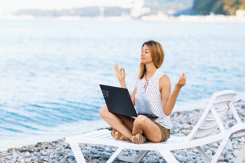 Спокойная женщина сидит на шезлонге у моря, отвлекается от работы за компьютером, медитирует и снимает негативные эмоции, совмещает удаленную работу с отдыхом
