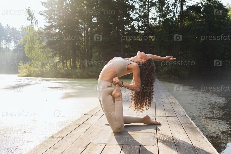 Женщина в спортивной одежде занимается йогой, выполняет упражнения Уштрасана с Вирасаной, поза верблюда и героя, тренируется на открытом воздухе в парке солнечным утром у пруда
