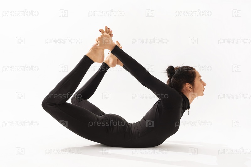 Женщина в черной спортивной одежде, практикующая йогу, выполняет упражнение дханурасана, позу лука, на белом фоне
