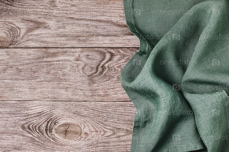 Зеленая скатерть на правой стороне деревянного стола, вид сверху. Макет для фона еды