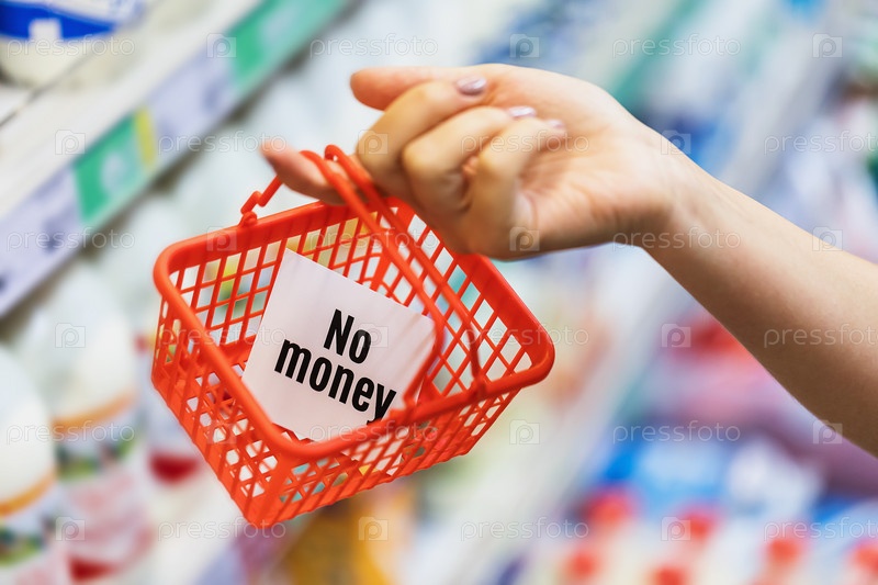 Маленькая пустая продуктовая корзина в руке. Понятие об отсутствии наличных денег для покупки продуктов питания. Денег нет, но ты держись