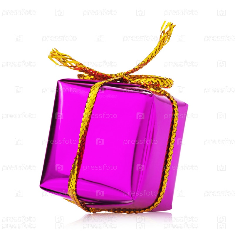 Подарок в коробке, перевязанной золотой лентой на белом фоне