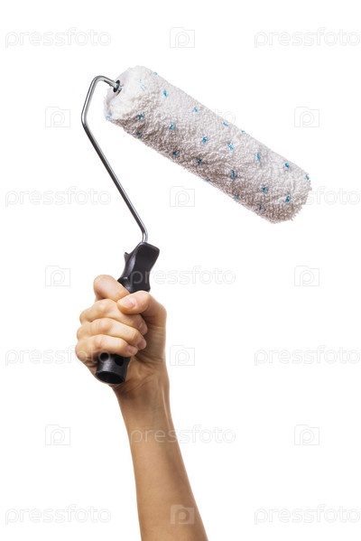 Женская рука поднята вверх, держит валик для покраски различных поверхностей. Рабочий с инструментом на белом фоне