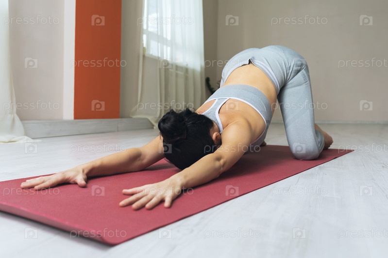 Женщина, практикующая йогу, выполняет вариант упражнения баласана, поза ребенка, тренируется на коврике в студии