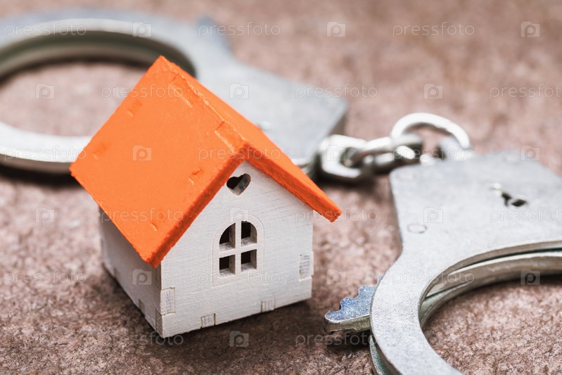 Игрушечный домик и наручники. Концепция мошенничества с недвижимостью