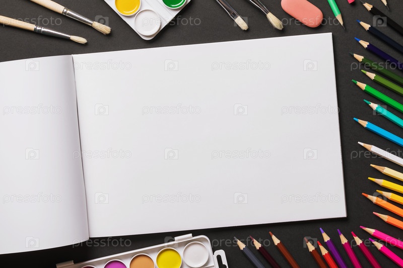 Акварельные краски, кисти, цветные карандаши и альбом для рисования на темном фоне с копировальным пространством, вид сверху