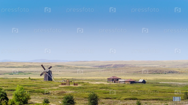 Аркаим, Челябинская область, Россия - 24 августа 2021 года: Ветряная мельница и казачья усадьба