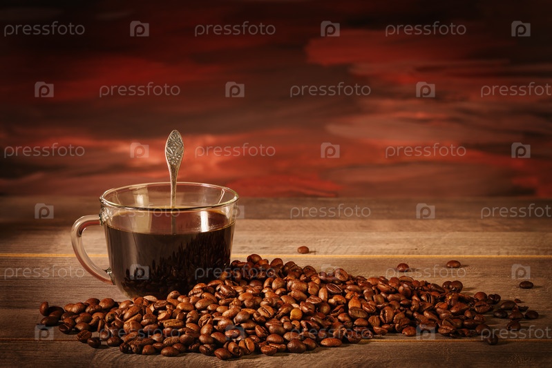 Чашка черного кофе с кофейными зернами на столе