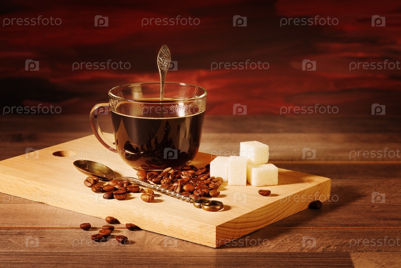 Чашка черного кофе с кусочками сахара и кофейных зерен на столе