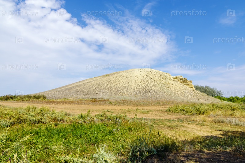 Песчано-каменистый холм в степи. Змеиная гора, природная достопримечательность. Соль-Илецкий район Оренбургской области, Россия