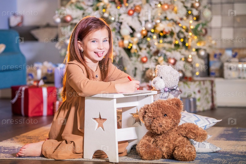 Девушка пишет письмо Деду Морозу на фоне елки и показывает язык