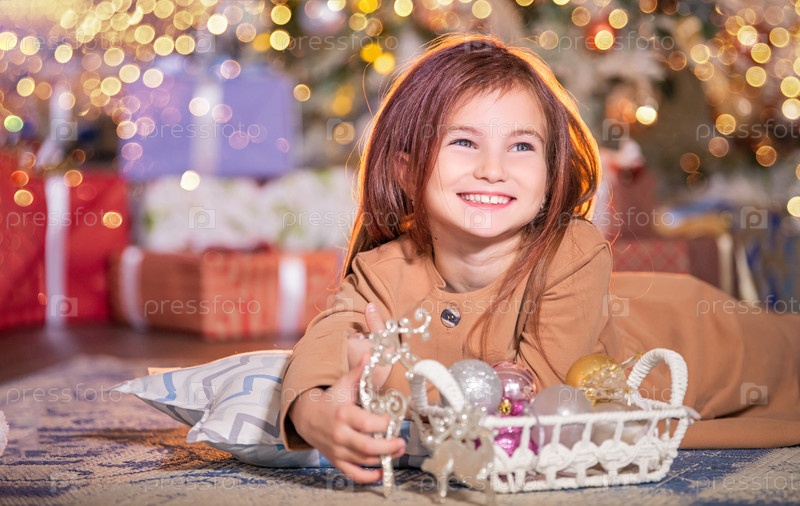 Смеющаяся девушка лежит на полу с рождественским украшением в руках на фоне елки