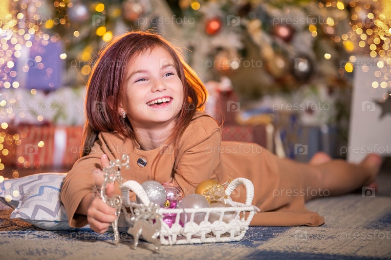 Веселая девушка лежит на полу на фоне елки и держит в руках новогоднее украшение из оленей