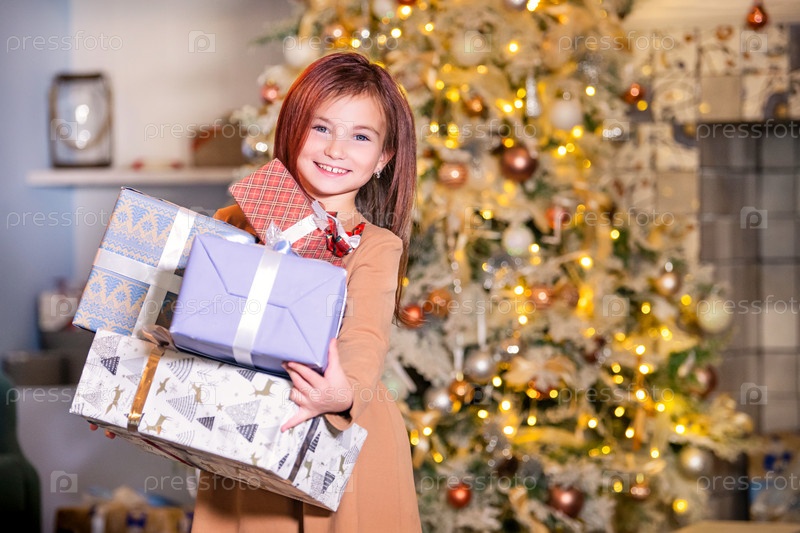 Девушка держит кучу коробок с подарками на фоне елки