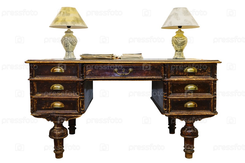Старинный письменный стол с настольными лампами, журналами и брошюрами. Изолированные на белом фоне