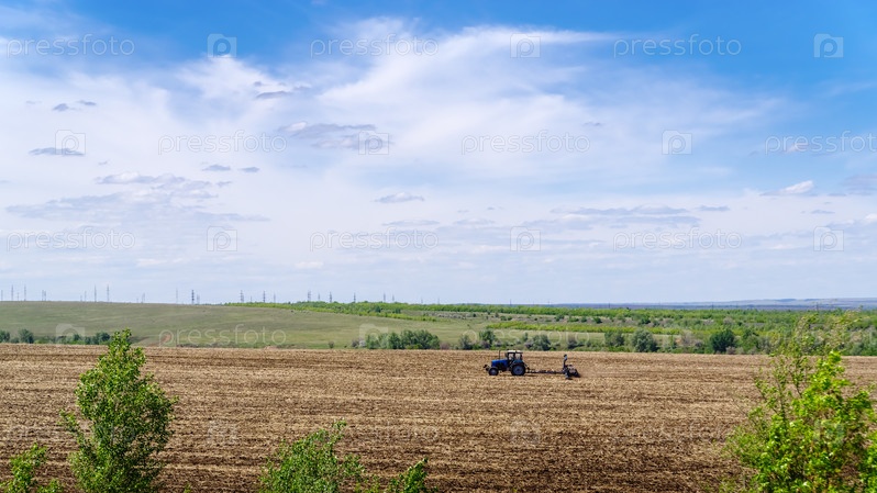 Трактор с стерневой сеялкой работает в поле. Фото сделано в России