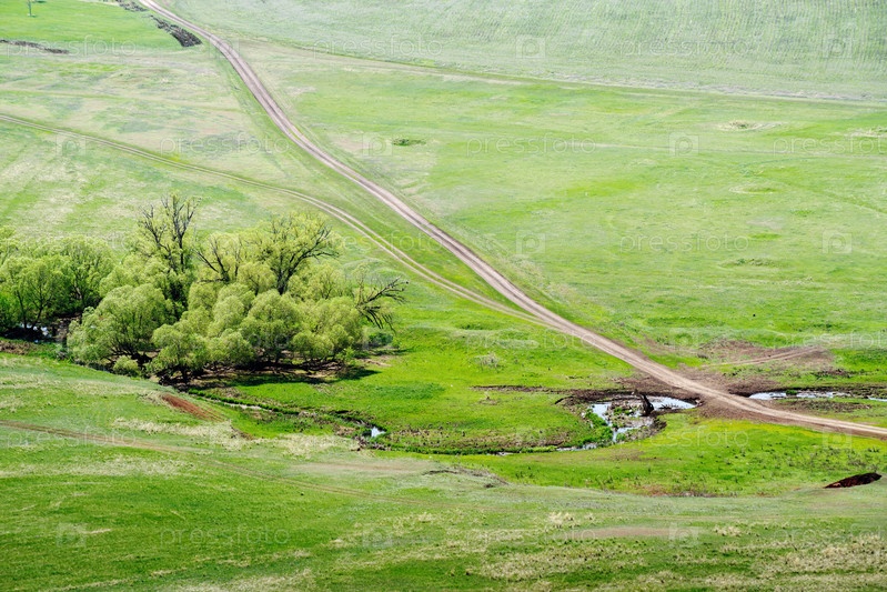Весенний сельский пейзаж с проселочной дорогой, пересекающей ручей. Фото сделано возле села Воскресеновка, Оренбургская область, Россия