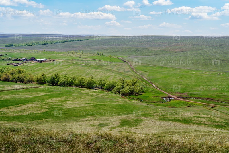 Весенний сельский пейзаж с фермой, полями и проселочной дорогой. Фото сделано возле села Воскресеновка, Оренбургская область, Россия