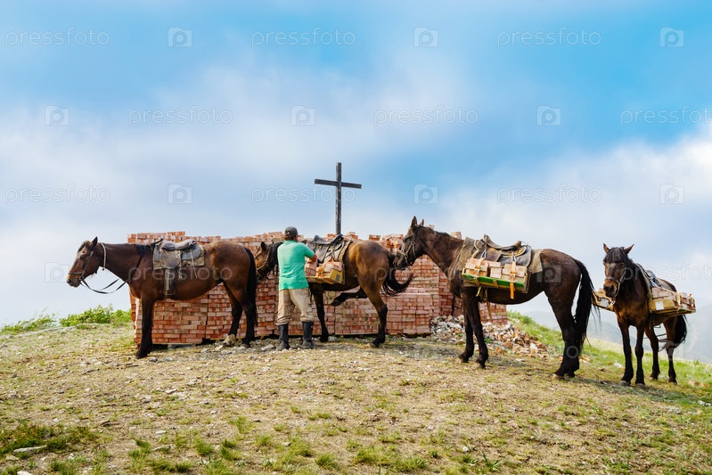 Деревня Андреевка, Саракташский район, Оренбургская область, Россия - 10 мая 2021 года: Вьючные лошади доставляют кирпичи на место восстановления разрушенной часовни. Снимок сделан на вершине горы Часовая