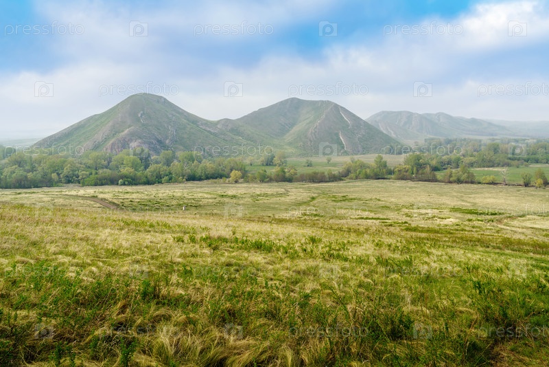Весенний горный пейзаж, Вид на Длинную и Сергеевскую горы со склона Часовой горы. Снимок сделан в районе поселка Андреевка Оренбургской области