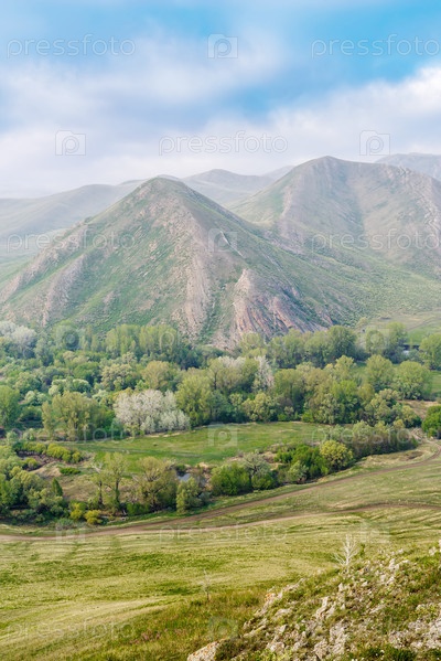Вид на весенний горный пейзаж сквозь туманную дымку. Андреевские конусы. Фото сделано возле села Андреевка, Оренбургская область, Россия